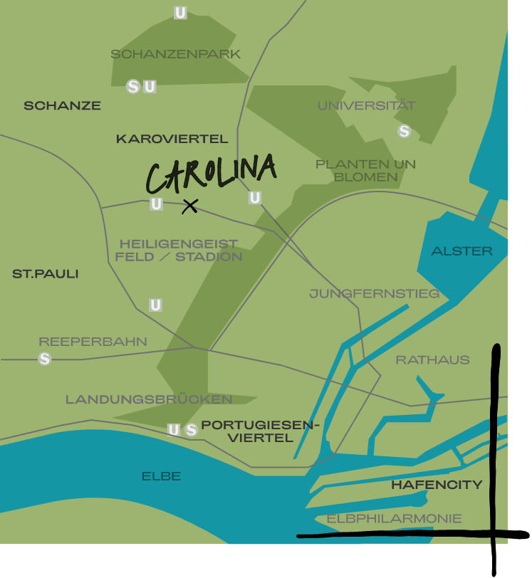 Für alle, die das Gefühl „Hamburg das Tor zur Welt“ hautnah (er)leben möchten, ist Carolina an der Feldstraße der perfekte Ort. Die Menschen aus dem Karoviertel strahlen eine Offenheit und Neugier für Unentdecktes aus und machen das Viertel somit zu einem multikulturellen Ort der Begegnungen.